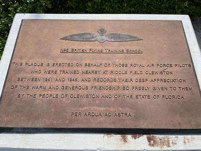 One of two plaques in Clewiston Civic Park remembering the RAF cadets who trained at 5BFTS, Riddle Field, Clewiston, between 1941 and 1945. Donated by the 5BFTS Association and dedicated in 1975. They are cared for by the City of Clewiston and were relocated within the park in 2016. Photograph taken in May 2025.